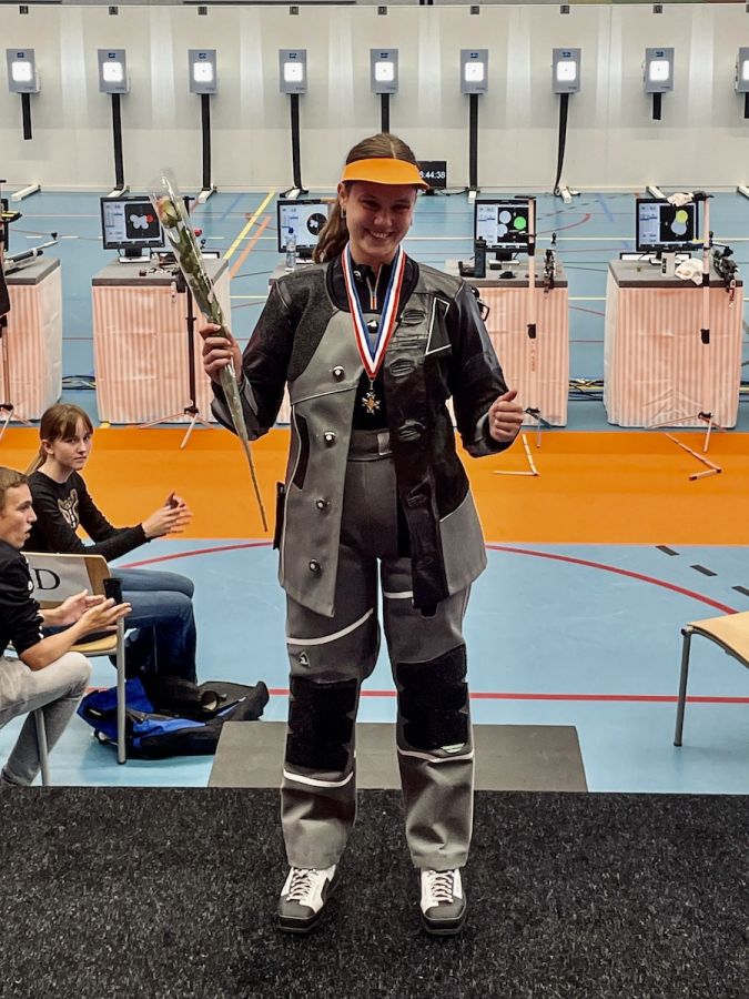 De Wijchense Tessa vertelt: “Zaterdagmiddag schoot ik mijn kwalificatiewedstrijd, hier schoot ik tegen 5 andere meiden uit onze klasse Junioren A-Dames. In de wedstrijd werd ik ruim 1e met mijn score.