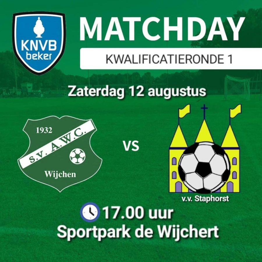 Aanstaande Zaterdag 12 augustus speelt AWC op de Wychert de eerste kwalificatieronde voor de KNVB-beker tegen Staphorst. Benieuwd naar het vernieuwde AWC?