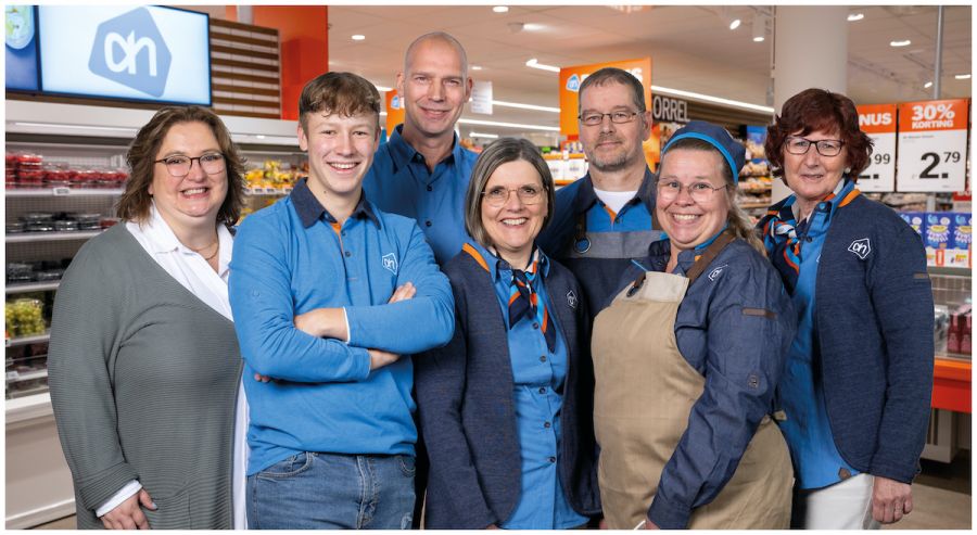 Het winkelteam uit Wijchen, maar dan al in de nieuwe bedrijfskleding. Foto - Albert Heijn Jan Linders, Dirk Brand.