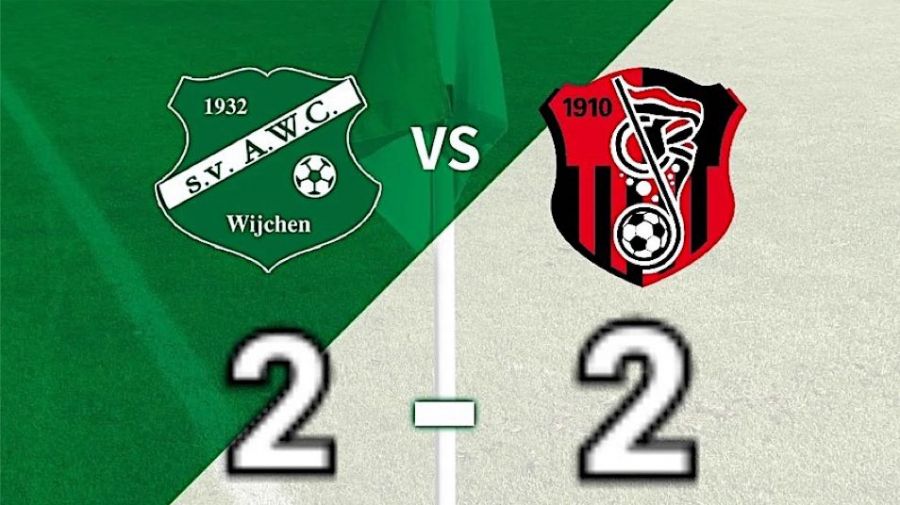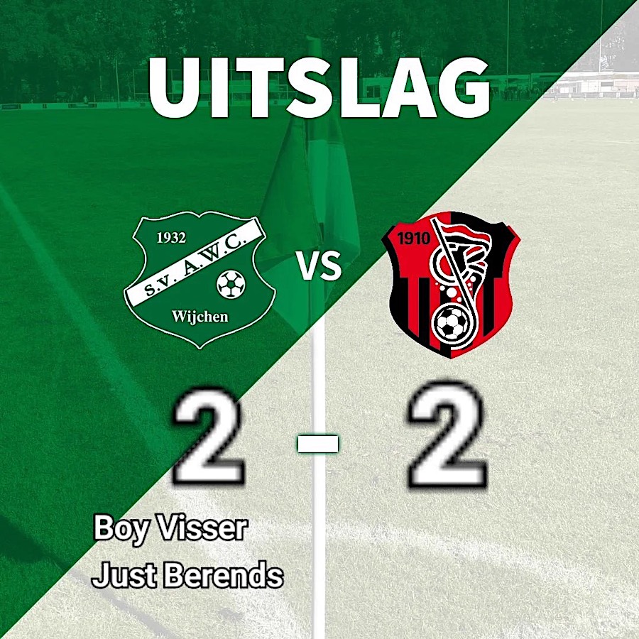 AWC trekt weer ten aanval en uit een ferme vrije trap net buiten het strafschopgebied knalt Just Berends de bal in het doel, buiten het bereik van de keeper: 2-2. Daarmee wordt de rust bereikt.