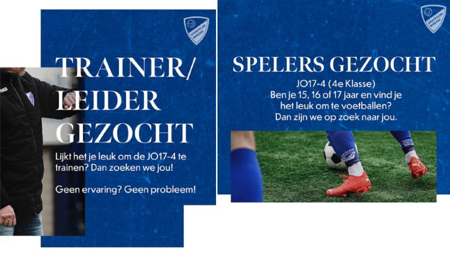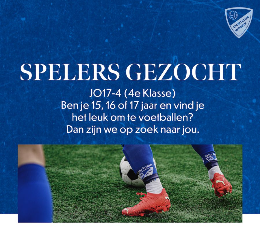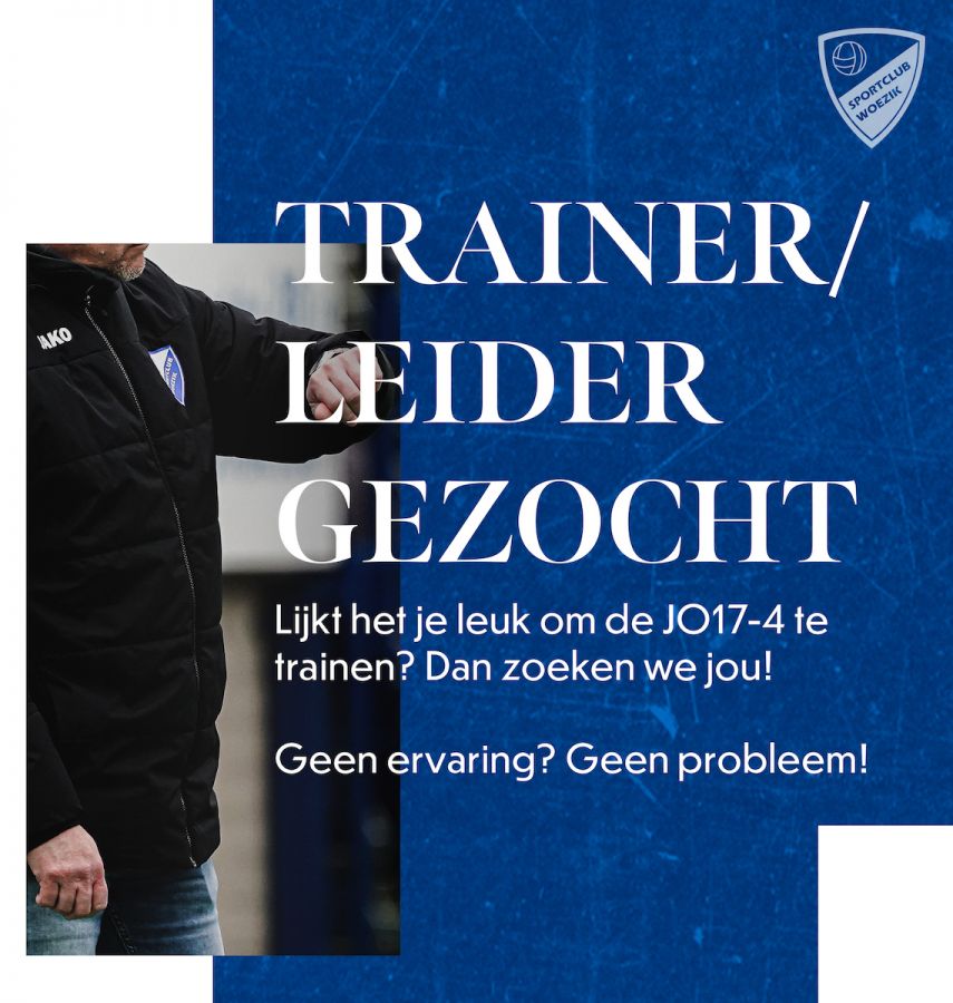 Voor de JO17-4 zoekt voetbalclub Woezik een trainer die op woensdagavond van 19.00 tot 20.30 uur training kan geven. Ook spelers én een teamleider kan JO17-4 goed gebruiken.