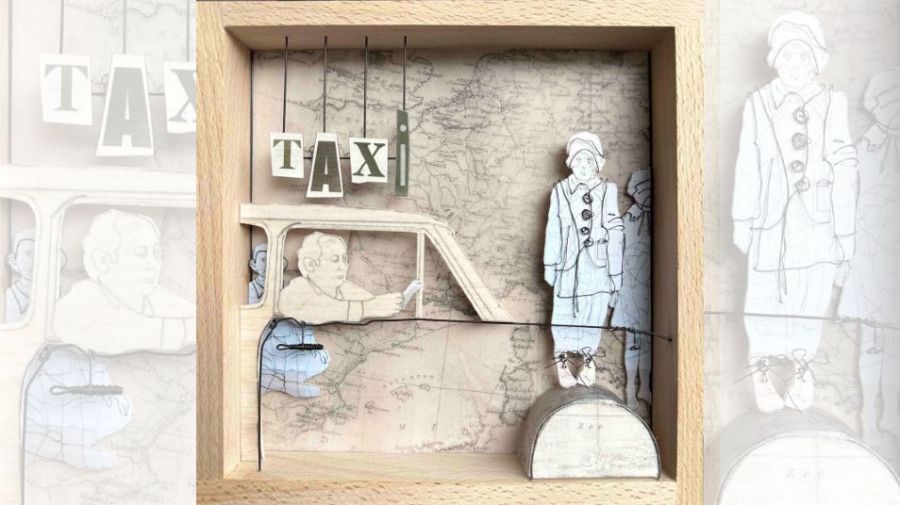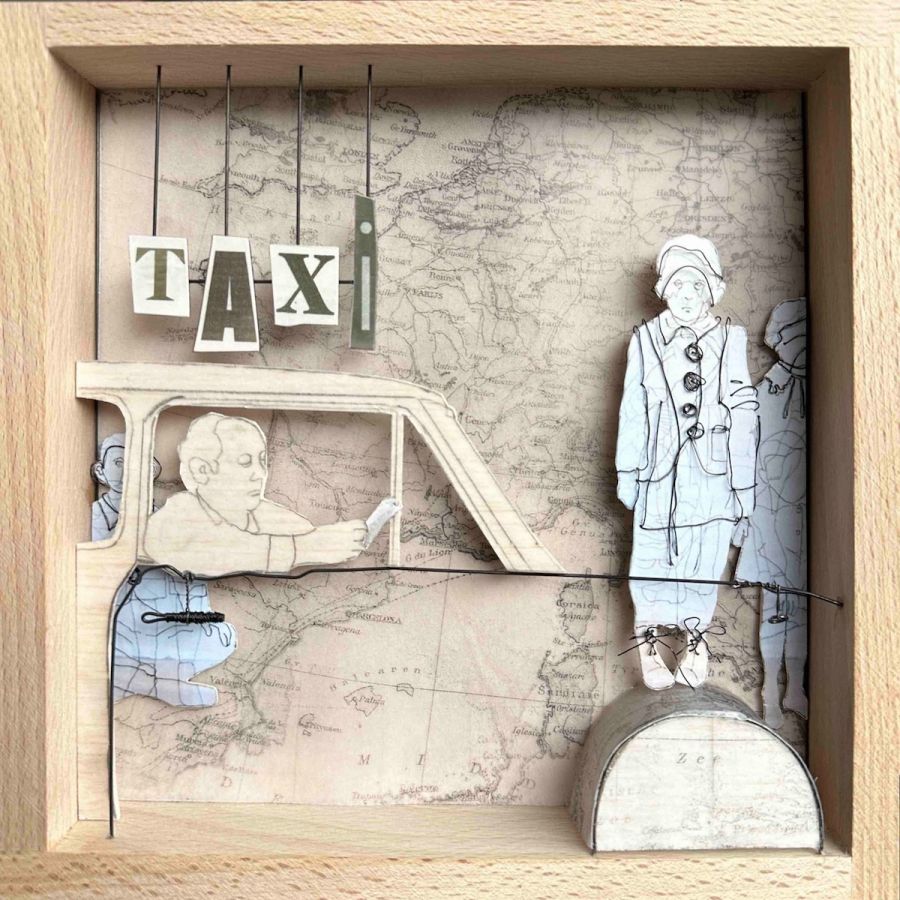 Wanda Janota begint haar werkstukken met verschillende foto’s. Daar verwijdert ze elementen uit, voegt samen, kopieert. Het resultaat is een vervreemdend beeld, uit balans, waar ze nieuwe materialen (ijzerdraad, touw, kleine voorwerpen) aan toevoegt. Zo ontstaat een theater-achtig schouwspel.