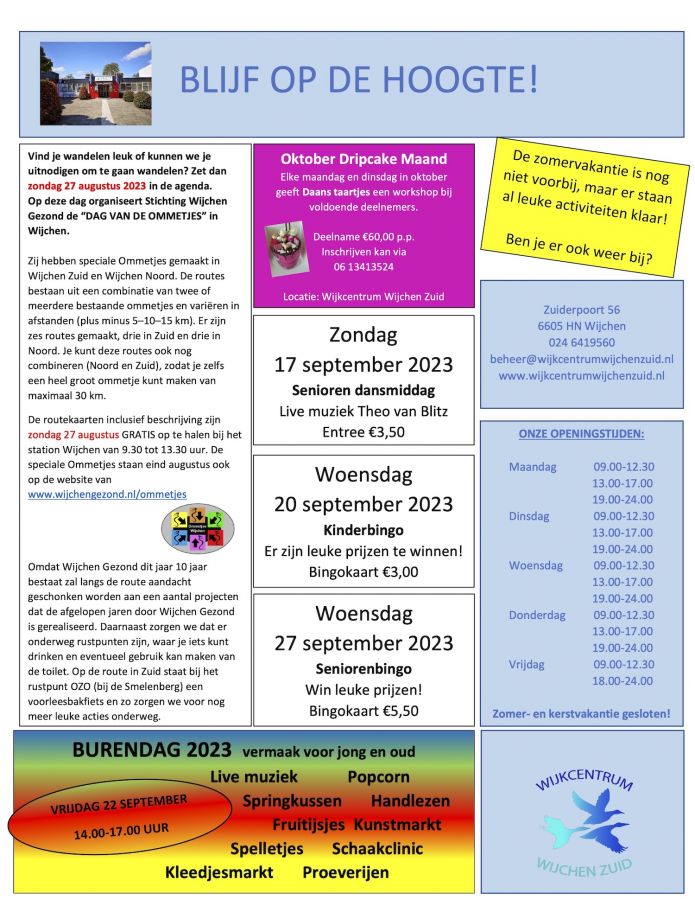 Ook in de maand september zijn er leuke activiteiten in Wijkcentrum Wijchen Zuid aan de Zuiderpoort 56. Kijk maar op de poster! Let op: schrijf de Burendag op 22 september alvast in je agenda!