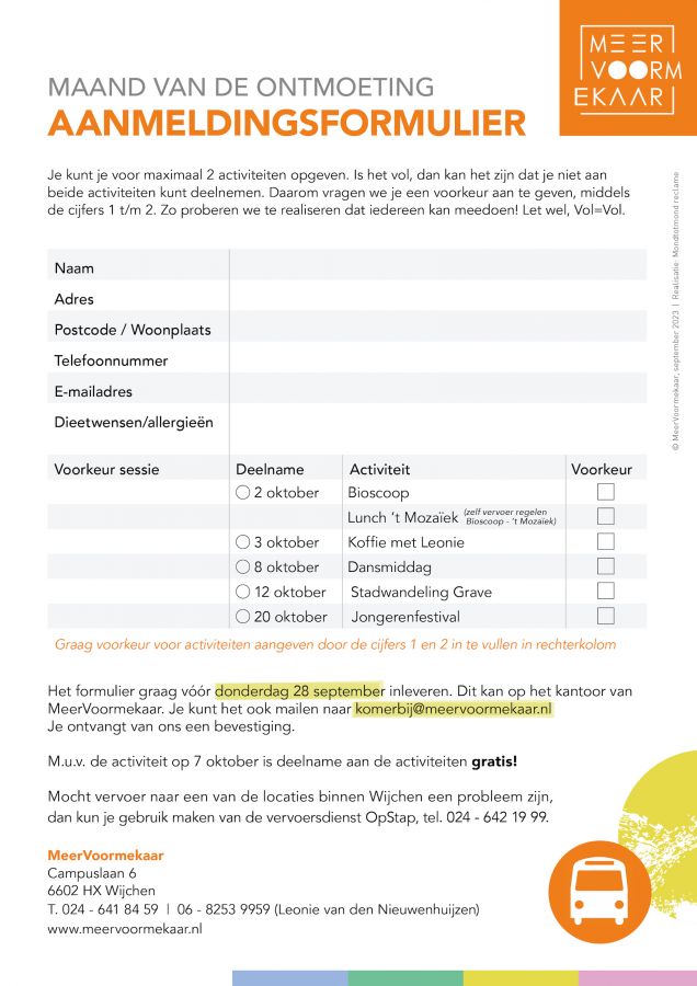 Klik op het programma hieronder om te zien wat er allemaal mogelijk is. Aanstaande woensdag komt het programma en het aanmeldformulier in de Wegwijs te staan. (de uitknipversie). De aanmeldformulieren zijn vanaf morgen ook verkrijgbaar bij 't Mozaïek, MeerVoormekaar (op de 1e verdieping) en bij de bibliotheek, alle aan de Campuslaan. Let wel. Vol=Vol.