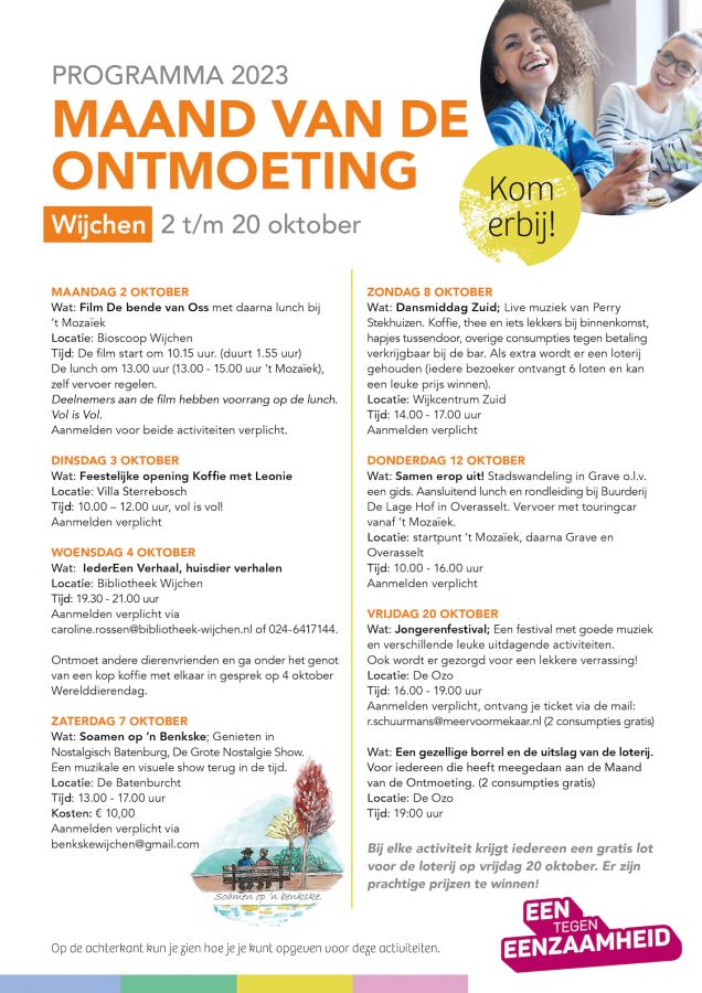 Ook in 2023 organiseert MeerVoormekaar in Wijchen de Week van de Ontmoeting. Vorig jaar was dit een zeer geslaagde en fijne week waar veel mensen elkaar hebben leren kennen. Een maand lang verrassende activiteiten waar je (op één na) gratis aan kunt deelnemen.
