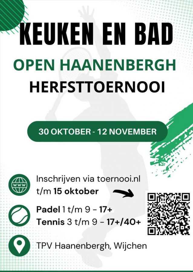 In 2023 wordt het Keuken- en Badherfsttoernooi gehouden bij TPV Haanenbergh op Sportpark Noord in Wijchen aan de Suikerbergseweg 12, van 30 oktober t/m 12 november. Aanmelden kan zowel voor tennis als padel tot en met 15 oktober.