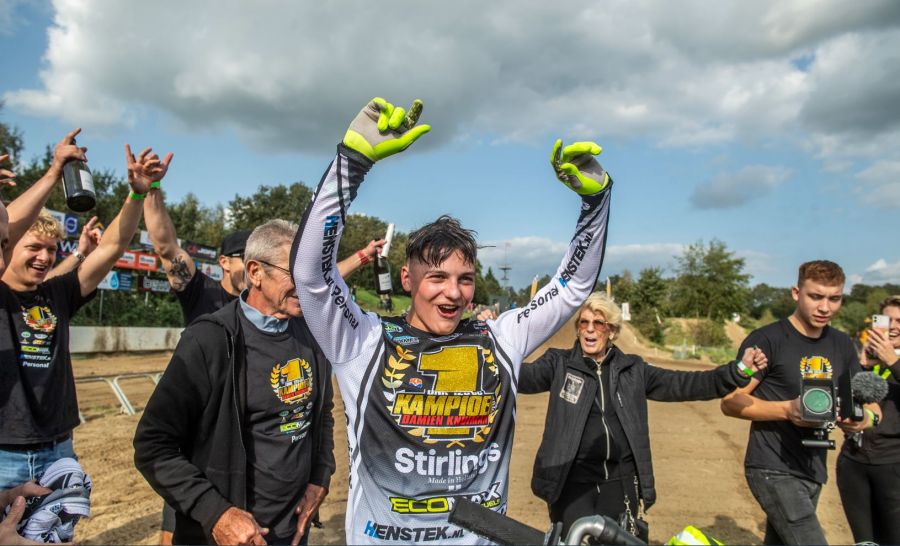 In de eerste manche was Damien goed weg met de start en kon hij de wedstrijd als derde rijder de eerste bocht insturen. Damien zette gelijk de aanval in en kon hij de koppositie in de eerste ronde veroveren. Zijn snelheid was goed en kon gestaag een voorsprong van ruim 6 seconden opbouwen. Consoliderend reed hij deze manche uit en bij de finish mocht hij zich de nieuwe Nederlands Kampioen 125CC noemen. Onder toeziend oog van de vele meegereisde supporters werd hij binnengehaald met rookbommen en champagne. Een geweldige prestatie van Damien, zijn monteur, trainers en team. Een beloning voor het harde werken.