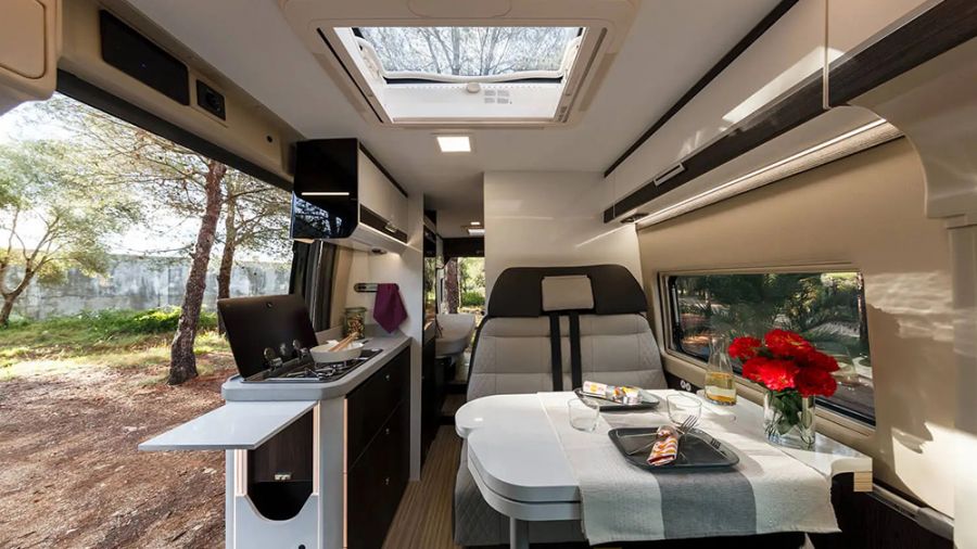 De twee lengtebedden achterin staan uit elkaar, waardoor in het midden een looppad ontstaat. Van de bedden is ook een groot tweepersoonsbed te maken. De buscamper heeft vier goedgekeurde zitplaatsen, waarvan twee met isofix-bevestiging. Van de zitgroep is nog een derde bed te maken. In de badkamer is een separate douche. De nieuwe Fiat Ducato met een 160 pk-motor doet dienst als basisvoertuig.