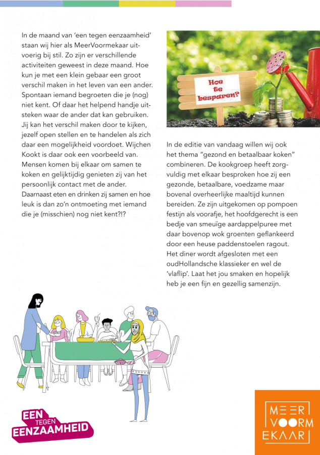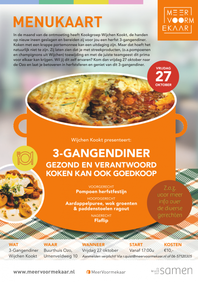 Kookgroep Wijchen Kookt is een initiatief van enthousiaste vrijwilligers die van koken en gezelligheid houden. Ze koken elke laatste vrijdag van de maand voor ongeveer 30 Wijchenaren en samen met hen genieten zij van een heerlijk 3-gangendiner. Zo ook in de Maand van de Eenzaamheid, op 27 oktober. Locatie: Wijkcentrum OZO, Urnenveldseweg 10, aanvang 17.00 uur, bijdrage: 10 euro. Aanmelden verplicht via r.quist@meervoormekaar.nl of bel 06-57120305.