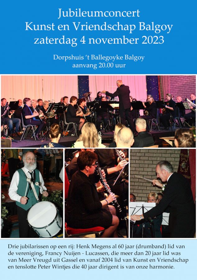 Op zaterdag 4 november zal in dorpshuis “’t Ballegoyke”, Boomsestraat 2b te Balgoij. een jubileumconcert worden gehouden.