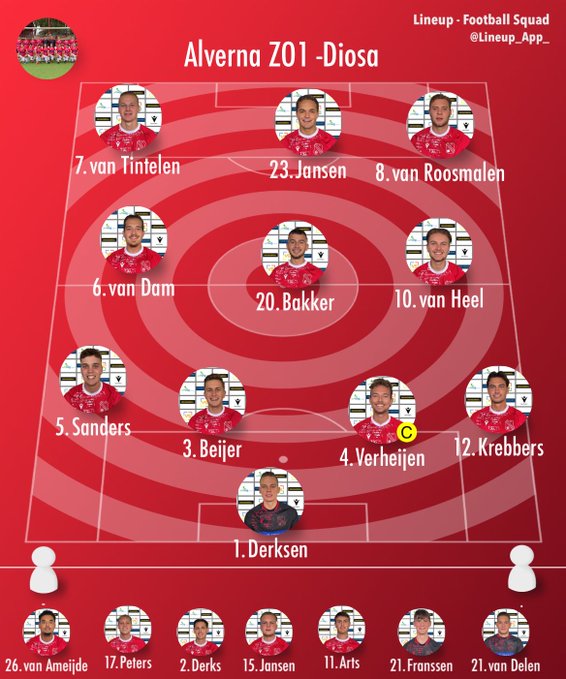 Jeffrey Derksen: Tychon Krebbers (68 Karsten Derks), Victor Beijer, Lars Verheijen, Wessel Sanders: Nick van Heel, Gijs Bakker(’72 Jordy van Ameijde) Senna van Dam(’46 Mattijn Arts): Jesper van Roosmalen, Sam Jansen(’72 Chiel Jansen) Niels van Tintelen (’68 Kevin Fransen):