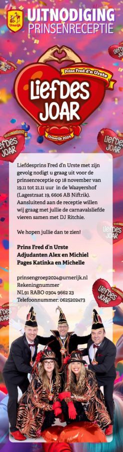 Zaterdag 18 november Prinsenreceptie in de Waayershof te Niftrik!