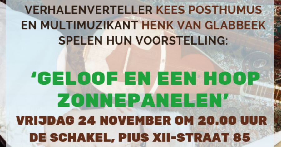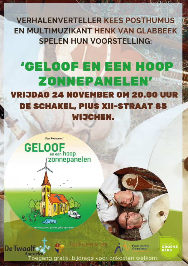 In een afwisselende, vrolijke voorstelling wordt door verhalenverteller Kees Posthumus en multimuzikant Henk van Glabbeek met tal van verhalen en liedjes de schepping gevierd. Ook worden zorgen gedeeld en onderzocht hoe we ons kunnen inzetten voor een duurzame toekomst. Naast verhalen en liedjes wordt er live gekookt, is er eco-fitness en hoort u (oosterse) muziek op de tar, ney en duduk.