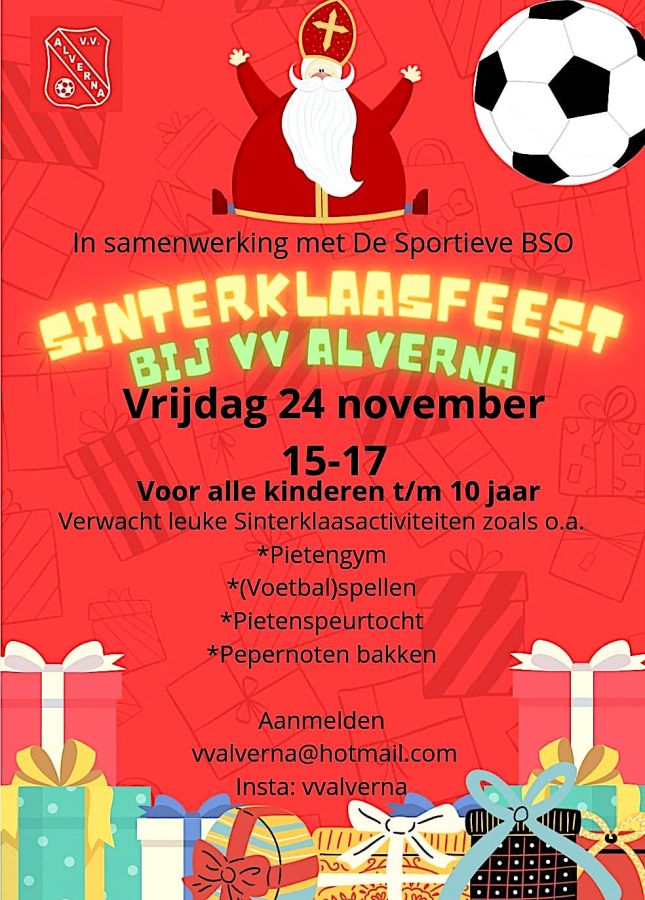 Op vrijdag 24 november van 15.00-17.00 uur is er gratis pietengym en (voetbal)spellen op Alverna voor jeugd tot ongeveer 10 jaar. Aanmelden via vvalverna@hotmail.com.