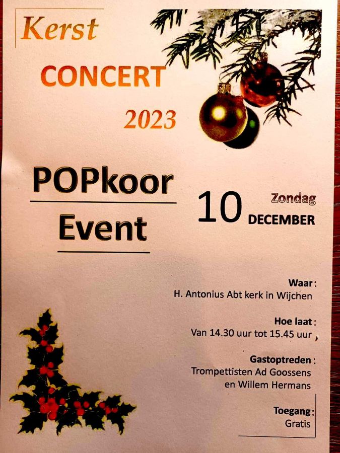 Zondagmiddag 10 december geeft POPkoor Event een Kerstconcert in de H. Antonius Abt-kerk in Wijchen. 14.30-15.45 uur, de toegang is gratis.