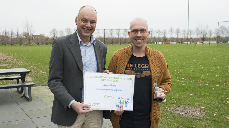 Zaterdag 16 december is vrijwilliger Jordy Houkes (rechts op de foto) uit Wijchen verkozen tot Gelderse boerenlandvogelvrijwilliger van 2023. Jordy is vrijwilliger bij Natuur Wijchen en is coördinator van de Patrijzentelgroep Maas en Waal Wijchen.