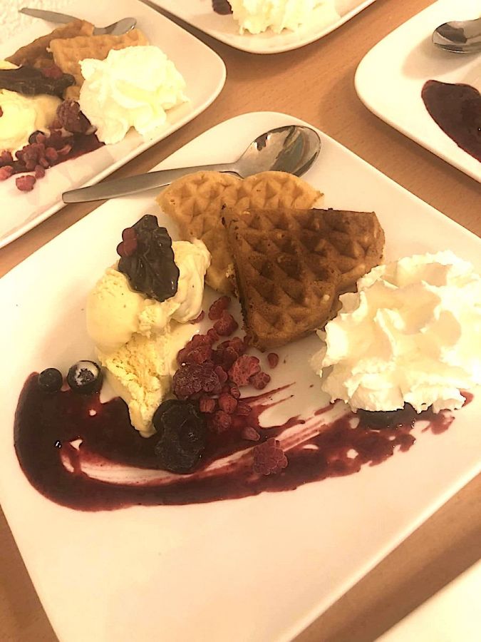 - wafeltjes met ijs, framboosjes, slagroom en bosbessensaus