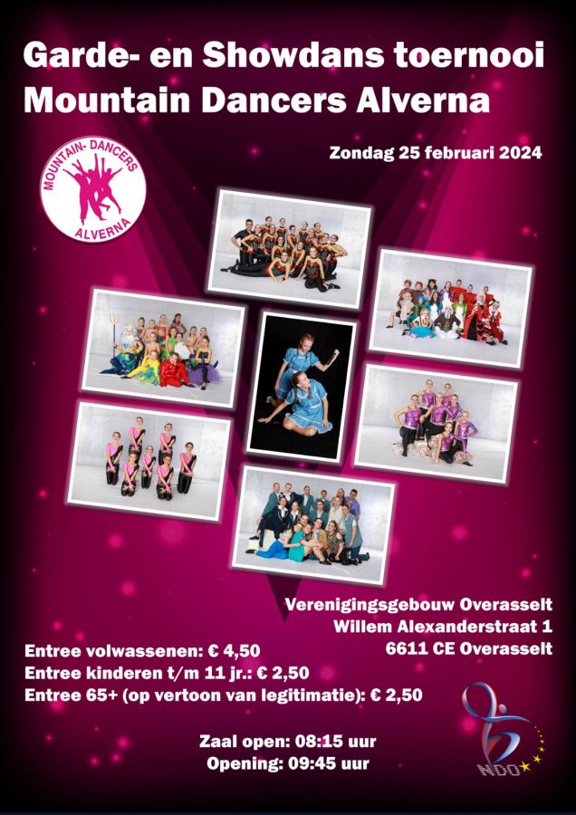 Het Garde en Showdanstoernooi wordt gehouden in het Verenigingsgebouw in Overasselt, Willem Alexanderstraat 1. De aanvang van het toernooi is om 9.45u. De Mountain Dancers zullen deze dag openen met een prachtige openingsdans. De laatste prijsuitreiking wordt verwacht rond 17.30u. De entree is € 4,50 voor volwassenen en € 2,50 voor kinderen en 65+ers op vertoon van pas.