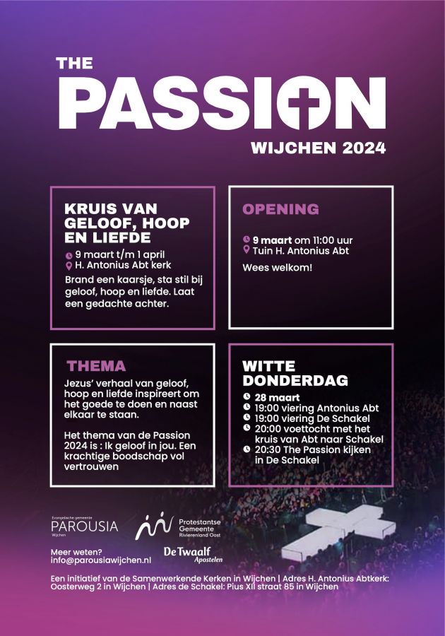 Een initiatief van de samenwerkende kerken te Wijchen. Jong en oud wordt uitgenodigd om op een speciale manier stil te staan bij een bijzonder verhaal: The Passion!