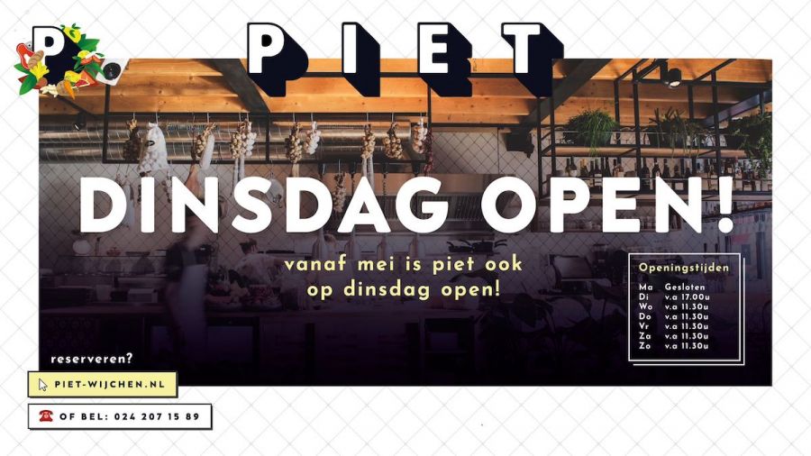 Per 1 mei zal Restaurant Piet ook op de dinsdag geopend zijn en dat is een nieuwtje. “Ja, voor de zomer hebben we natuurlijk ook weer allerlei ideeën en een uitbreiding hoort daar bij. De dinerkaart wordt vernieuwd en onze chefs kunnen zich daar volledig in uitleven. “Ik voorspel u: dat wordt smullen!”
