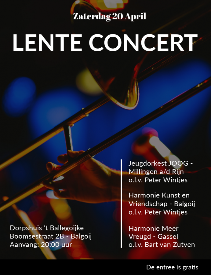 Op zaterdag 20 april a.s. zal in Dorpshuis “’t Ballegoyke” aan Boomsestraat 2b in Balgoij een Lenteconcert gegeven worden. Naast Harmonie Kunst en Vriendschap zullen ook twee andere verenigingen deelnemen aan dit concert, te weten: