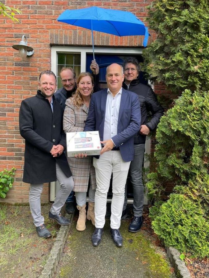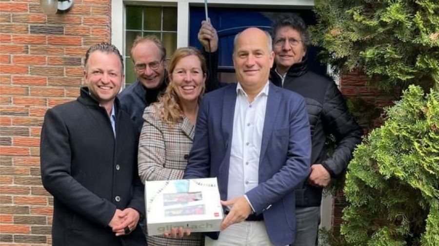 De jury en wethouder Martijn Derks (links op de foto) hebben nu alle genomineerde ondernemers het heuglijke nieuws verteld en tevens een heerlijke taart afgegeven. Maar wie zullen nu de grote winnaars worden?
