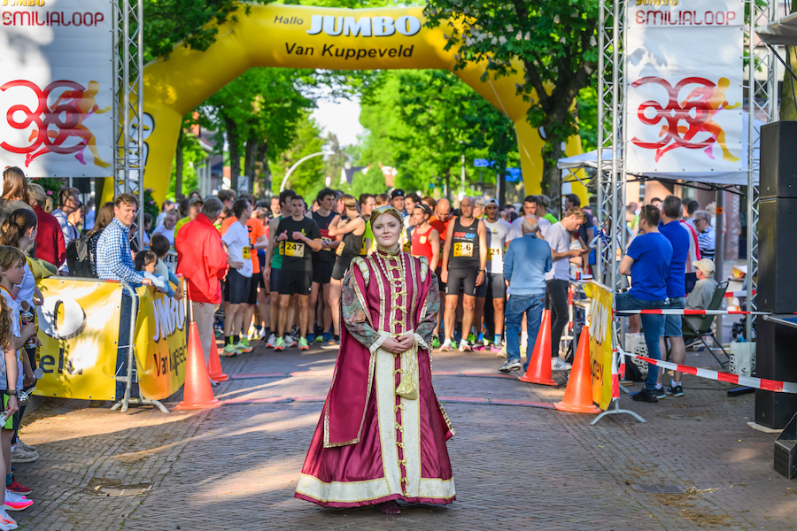 aanwezig in een van haar mooiste jurken. Ze komt de hardlopers aanmoedigen en je kunt