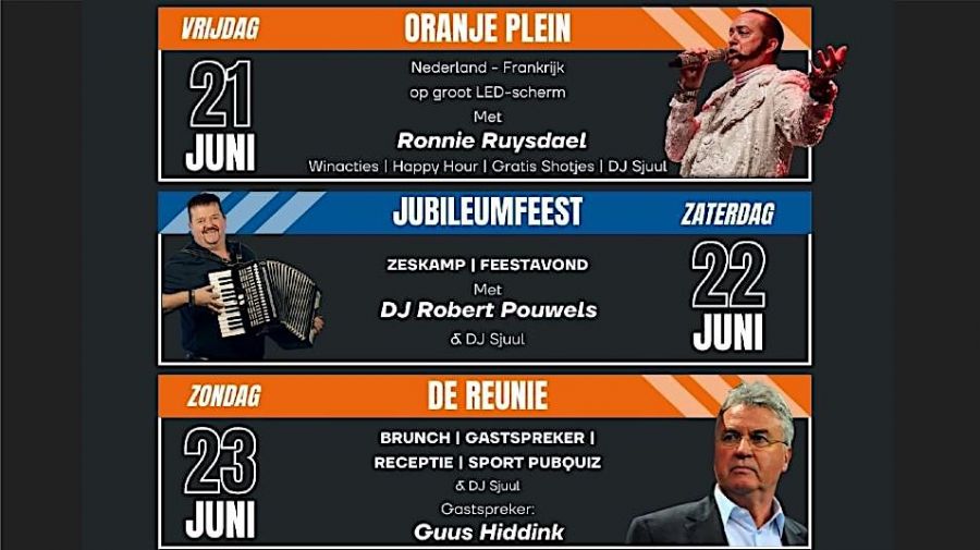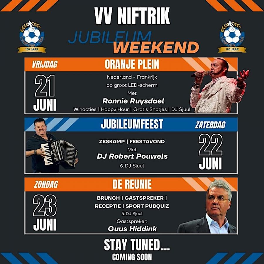 Daarmee is v.v. Niftrik de oudste club van de gemeente Wijchen! Op vrijdag 21 juni in de feesttent op het Oranjeplein wordt om 21.00u de wedstrijd Nederland - Frankrijk bekeken met na afloop een optreden van Ronnie Ruysdael! Op zaterdag 23 juni is er 's middags een gezellige Zeskamp met daarna een feestavond met DJ Robert Pouwels. Tot slot is er op zondag 23 juni vanaf 13.00u een Reünie-brunch met Guus Hiddink en een Pubquiz. Dat wordt dus ongetwijfeld een superfeest in Niftrik!