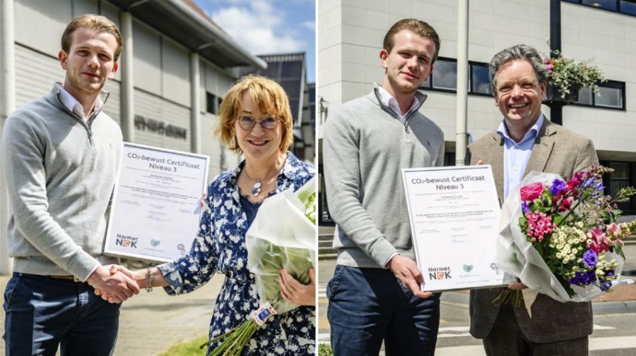 Foto's: Bea Schouten en Ronald Thoonen, wethouders van resp. Wijchen en Druten krijgen het CO2-bewust Certificaat uit handen van Stijn van Nistelrooij, accountmanager bij Normec. (Foto’s: Henk Hulshof).