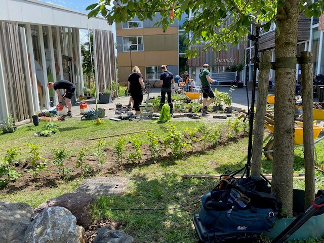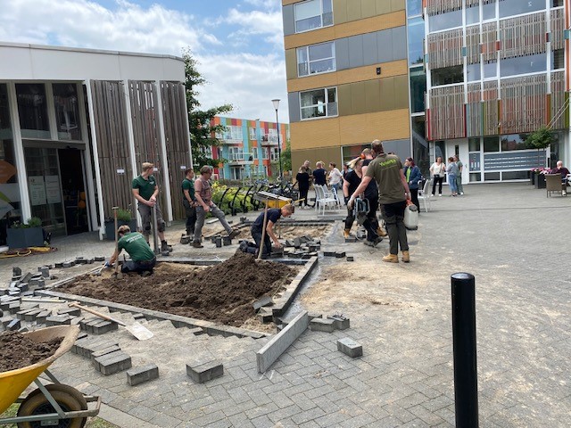 De Yuverta-leerlingen konden praktijkervaring opdoen met het aanleggen van plantsoenen. Het Odensehuis heeft een prachtige ingang gekregen met groene perken en een nieuwe haag en het klimaat profiteert omdat het regenwater nu weer beter de bodem in kan.