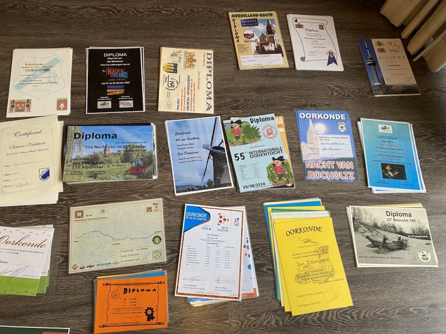 Extreem wandelen doet Jan vanaf zijn 49e jaar. Naast de 250e Kennedy Marsen heeft de Wijchenaar verder ook nog 11 x de Dodenmars van 100 km gelopen en 125 Long Distance Walks die tussen de 110 de 160 km zijn. Ook liep hij 7 keer Nijmegen - Rotterdam van 160 km, 10 keer Amsterdam - Leeuwarden 150 km, 11 keer De Megelland - route van 135 km en 8 keer Amsterdam- Tilburg van 125 km. We praten hier dus niet over een 'gewone' wandelaar, zult u begrijpen. Met het totaal van alle marsen is Jan Dinnissen in Nederland ongeëvenaard!