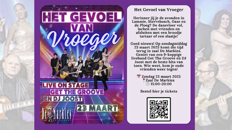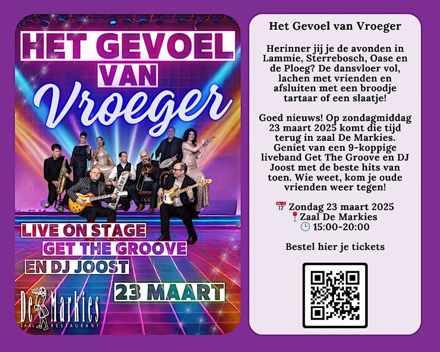 De dansvloer van De Markies vol, lachen met vrienden en genieten van de liveband Get The Groove en DJ Joost! En natuurlijk ga je afsluiten met een broodje tartaar of een slaatje! Kom genieten op zondag 23 maart van 15.00u tot 20.00u bij De Markies aan de Graafseweg op Alverna! Bestel je kaarten à €10 gemakkelijk met de QR-code op de afbeelding.