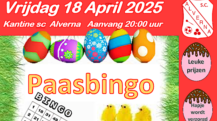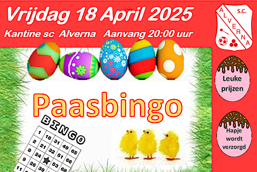 Op Het Bospad 5 is er bij sportclub Alverna op 18 april een gezellige Paasbingo. Iedereen is welkom!