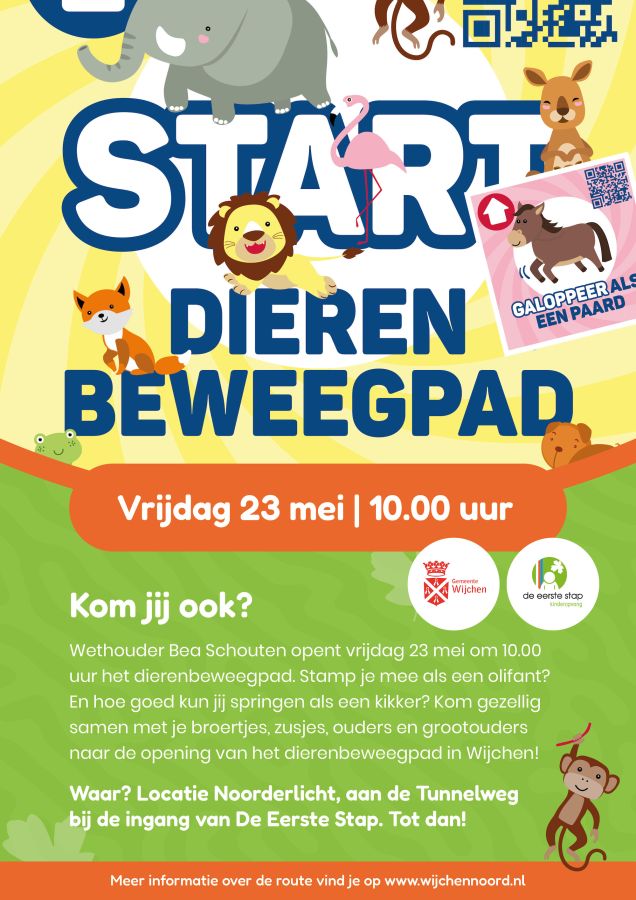 De opening van dit dierenbeweegpad is op vrijdag 23 mei om 10.00 uur en vindt plaats bij het startpunt aan de Tunnelweg. Wij nodigen zoveel mogelijk (groot)ouders met jonge (klein)kinderen uit om deze opening mee te vieren!