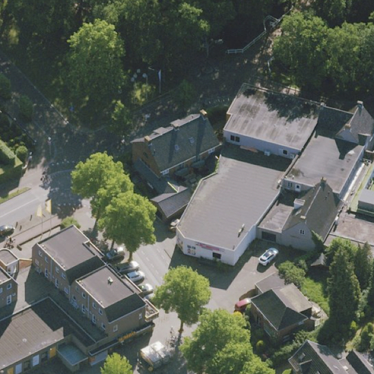 Foto 1: Luchtfoto Spoorstraat / Herenstraat. Op plek verloederde gebouwen en tweekapper komen straks 51 appartementen.