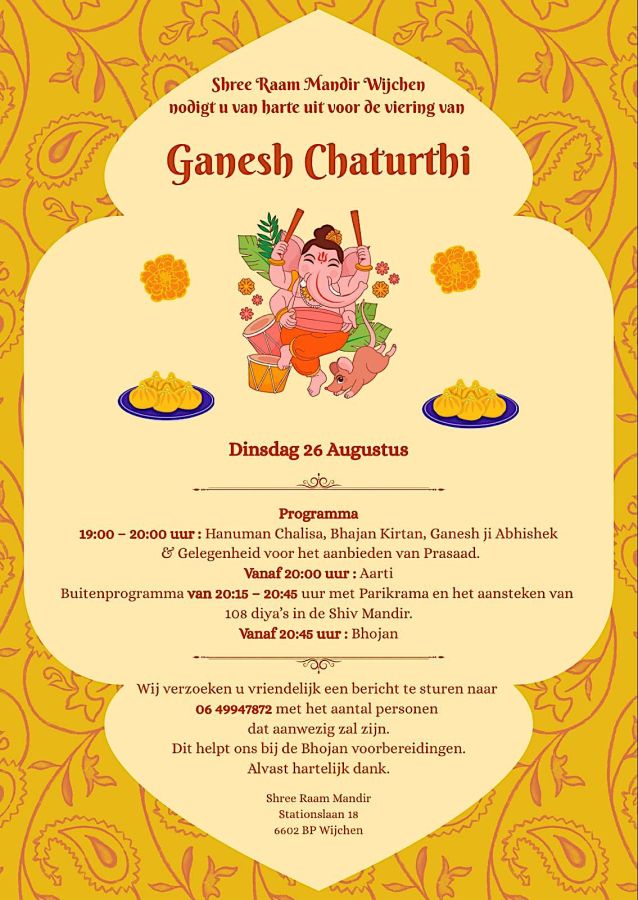 Shree Raam Mandir Wijchen nodigt uit: Ganesh Chaturthi