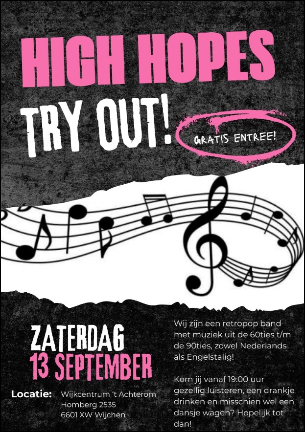 Op zaterdag 13 september 2025 komt de band High Hopes in ’t Achterom aan de Homberg 2535 hun muziek van de 60's t/m de 90's spelen. Dit is de eerste keer (try out). Als dit goed bevalt komen ze vaker!