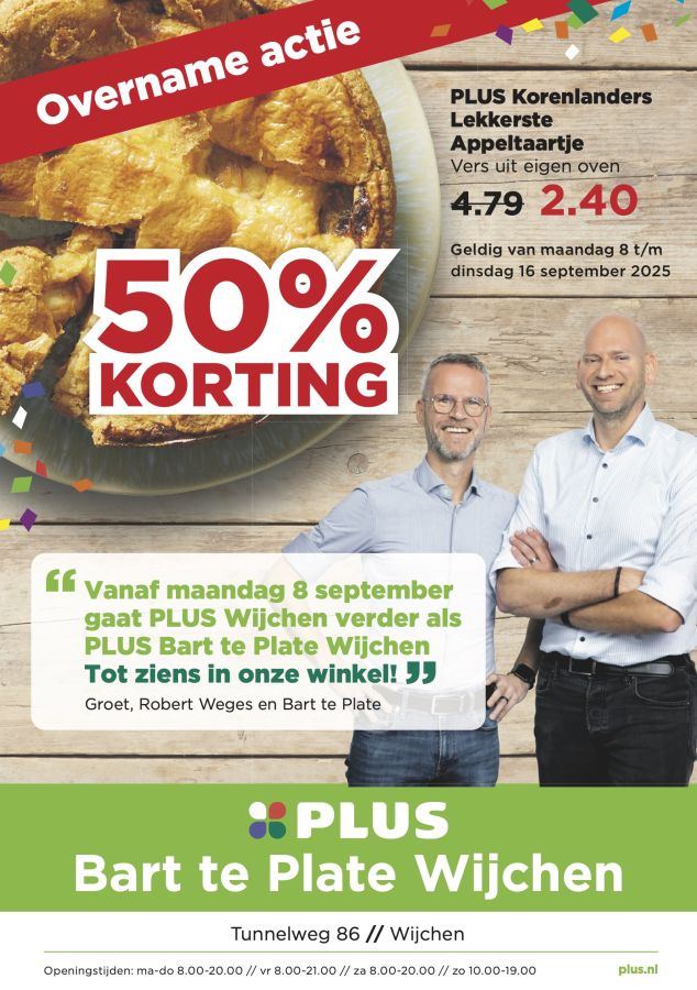 “Wij zijn de trotse ondernemers achter PLUS Bart te Plate in Wijchen. Met jarenlange ervaring in de supermarktbranche en een passie voor lokaal ondernemerschap staan wij, samen met bedrijfsleider Erik Jung en het gehele team, elke dag klaar om u de beste winkelervaring te bieden.”