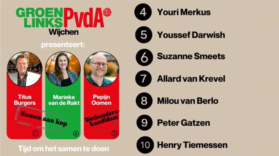 Lijsttrekker Titus Burgers kijkt uit naar de verdergaande samenwerking met GroenLinks. ‘Ik ben trots op onze top 10, waarin we een mooie balans hebben gevonden tussen de twee bloedgroepen en waarin we heel wat jong talent hebben zitten.’ Op nummer 4 en 5 staan Youri Merkus (huidig raadslid van de PvdA) en Youssef Darwish. De lijst gaat verder met Suzanne Smeets, Allard van Krevel, Milou van Berlo, Peter Gatzen en Henry Tiemessen.