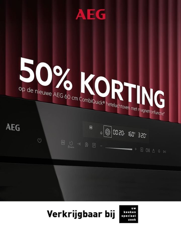 Extra goed nieuws: je krijgt tijdelijk 50% korting op de brutoprijs als je 4 AEG-inbouwapparaten koopt inclusief deze oven. Verkrijgbaar bij Janssen Keukens!