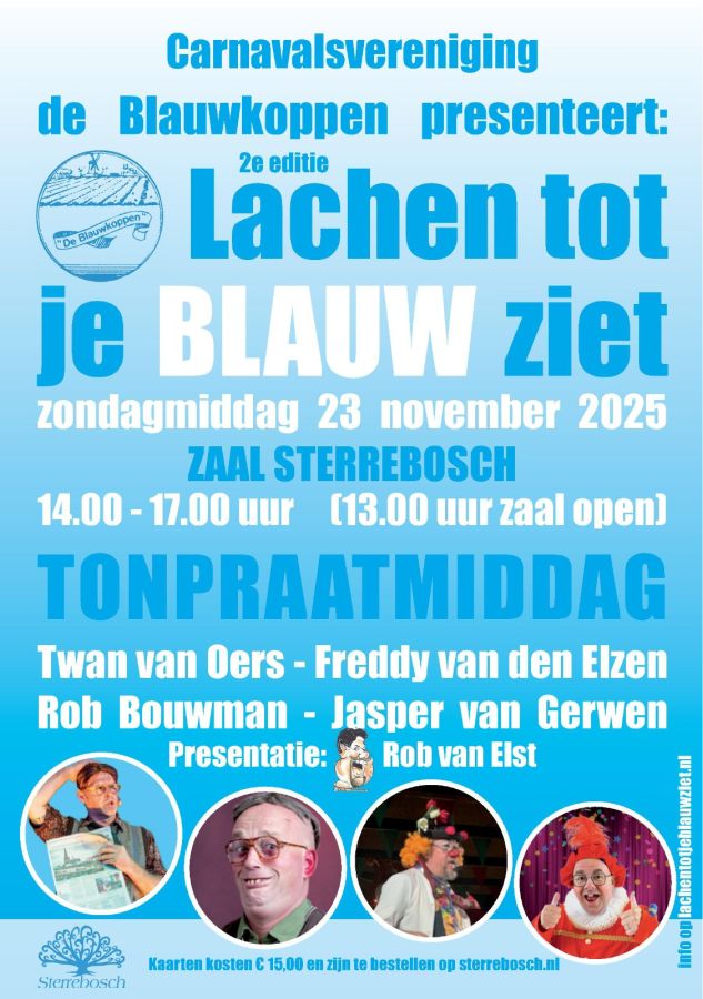 Na het daverende succes van vorig jaar organiseert Carnavalsvereniging De Blauwkoppen opnieuw een middag vol topvermaak: “Lachen tot je blauw ziet”. Op zondag 23 november 2025 verandert zaal Sterrebosch in Wijchen in een ware lachtempel, waar de crème de la crème van de Nederlandse tonpraatscène het podium betreedt.