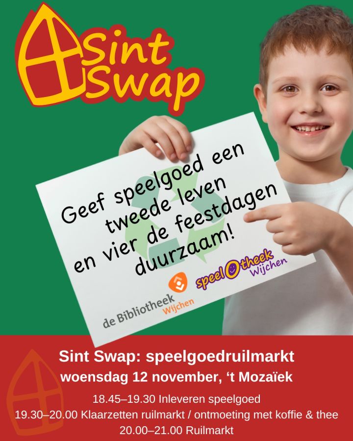 Tijdens de Klimaatweek organiseert speelOtheek Wijchen in samenwerking met de Bibliotheek Wijchen de Sint Swap, een speelgoedruilbeurs die plaatsvindt op woensdagavond 12 november. Op deze dag kan je speelgoed waar je eigen kinderen mee zijn uitgespeeld inleveren en ruilen voor “nieuw” speelgoed. Zo krijgt speelgoed een tweede leven en vier je de feestdagen duurzaam.