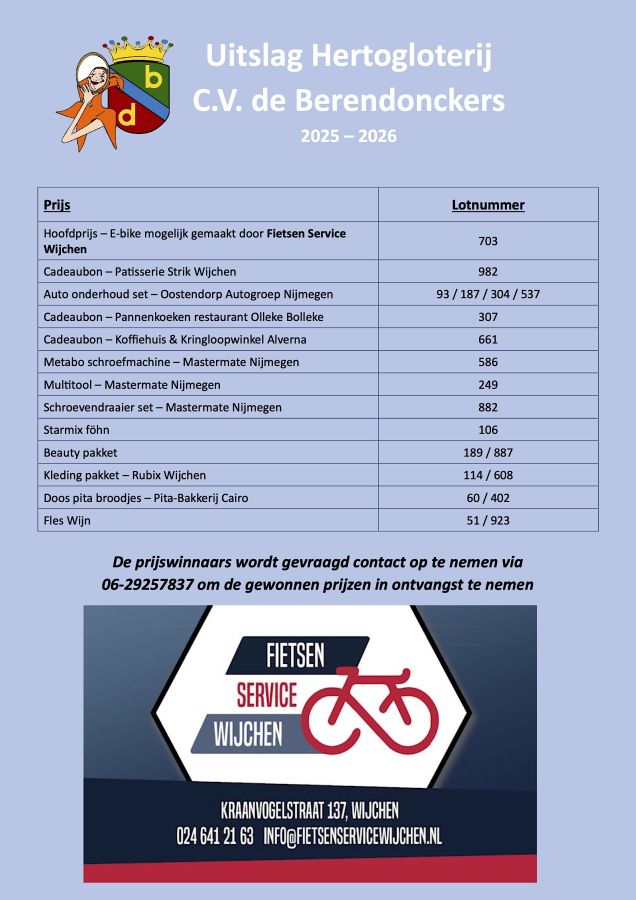 Nu de nieuwe Hertog van 't Vênnegat bekend is gemaakt (Ronald d'n Urste, kijk hier naar het vrolijke fotoverslag van Marion ARTs Foto), zijn ook de winnende lotnummers bekend van het gokje op de nieuwe Hertog / Hertogin. Voor 2,5 euro kon men al meedoen aan de loterij en uiteraard zijn er weer mooie prijzen. De hoofdprijs is een prachtige e-Bike, mogelijk gemaakt door Fietsen Service Wijchen! Hieronder de winnende lotnummers! Aan de gelukkige bezitters ervan wordt gevraagd contact op te nemen via 06-29257837 om de gewonnen prijzen in ontvangst te nemen.