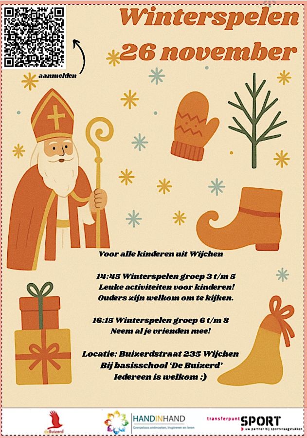 Transferpunt Sport organiseert In samenwerking met Stichting Hand in Hand op woensdag 26 november een sportieve en feestelijke middag voor kinderen uit groep 3 t/m 8: de Winterspelen Hand in Hand.
