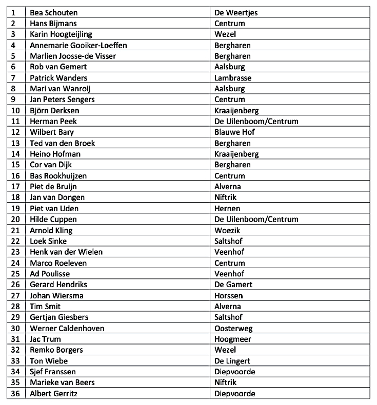 De gehele kieslijst van het CDA Wijchen met 36 personen ziet er als volgt uit: