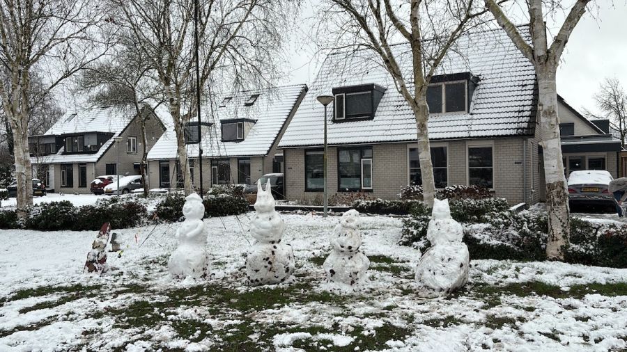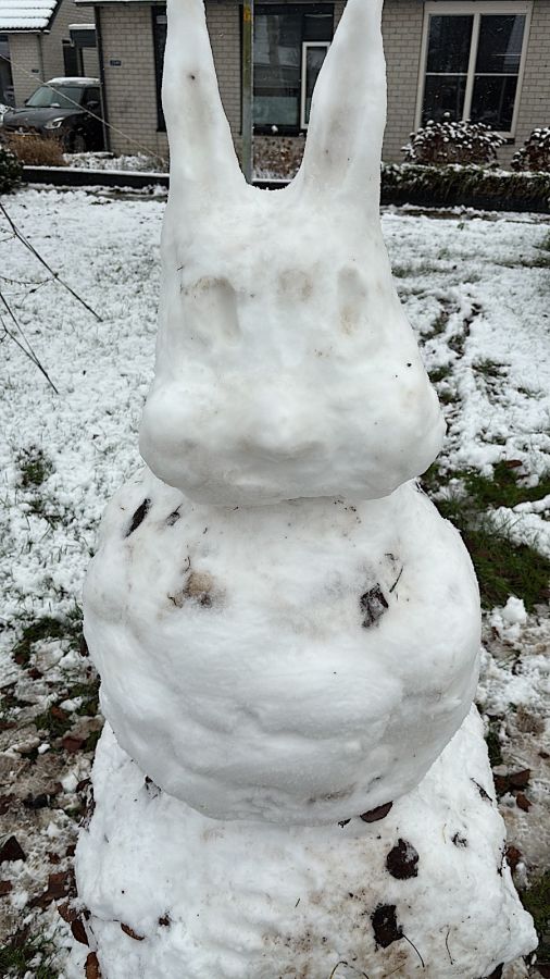 Ook de familie Van Os op de Veenhof is creatief geweest met de sneeuw. Op deze foto zie je Mario, een konijn, een sneeuwpop en een kat.