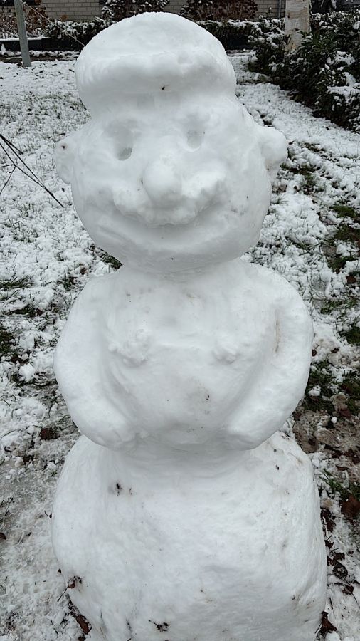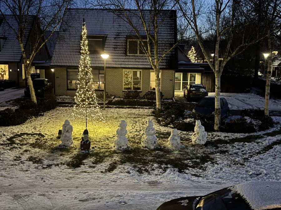 In de avond is er een pinguïn bij gekomen (helemaal links). "De sneeuwsculpturen by night met onze mooi verlichte buurtkerstboom maakt het helemaal af!"