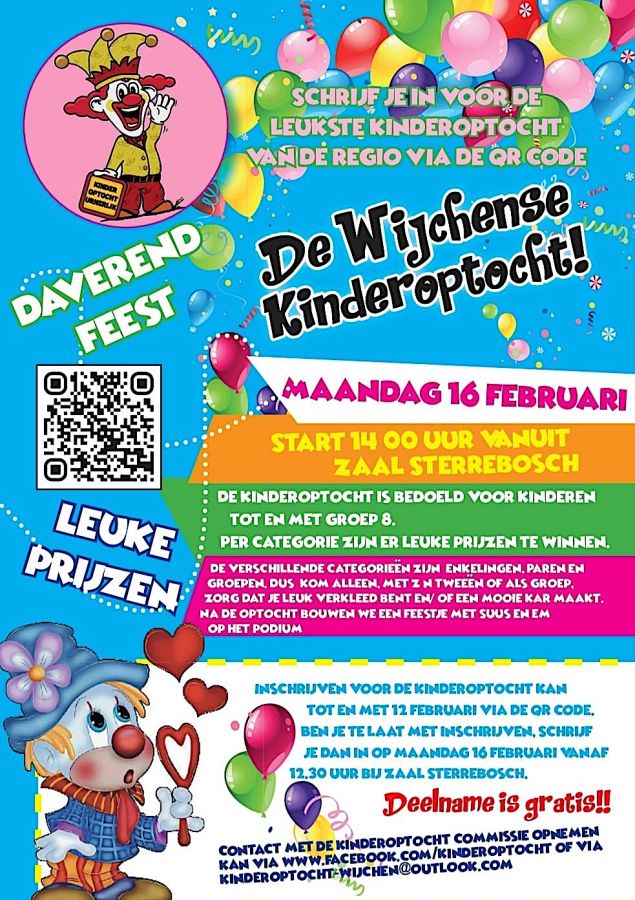 Op maandag 16 februari is er weer de Kinderoptocht van carnavalsvereniging De Blauwkoppen, alle info staat op onderstaande flyer. Je kunt je nu online inschrijven met de QR-code of via deze link: bit.ly/kinderoptocht