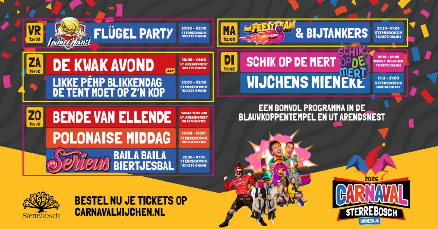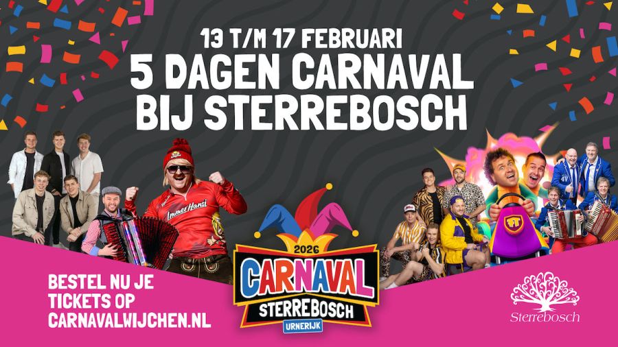Natuurlijk is er nog veel meer te beleven tijdens carnaval bij Sterrebosch. Het volledige programma met de leukste artiesten en tickets voor de avondprogramma’s is te vinden op carnavalwijchen.nl.