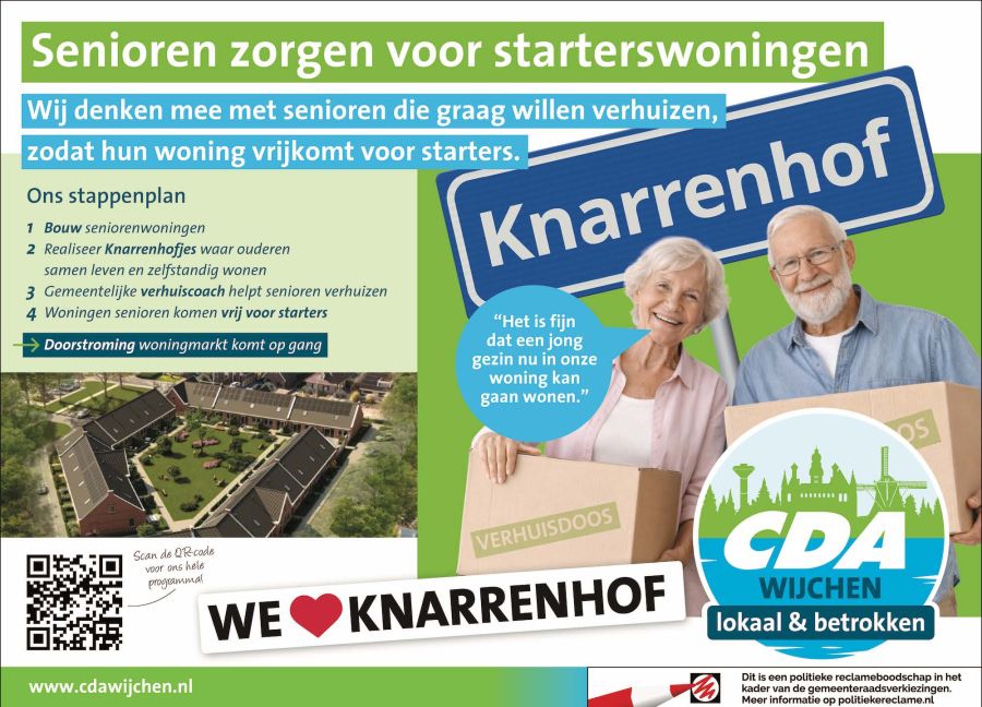 Op deze manier komt hun huur- of koopwoning dan vrij voor starters en jonge gezinnen. CDA Wijchen zorgt met dit idee voor een eerste aanzet voor de noodzakelijke doorstroming op de woningmarkt in Wijchen en de dorpen.